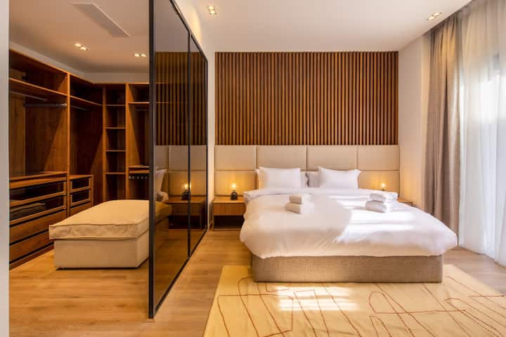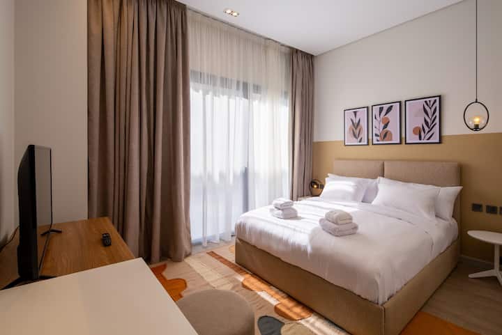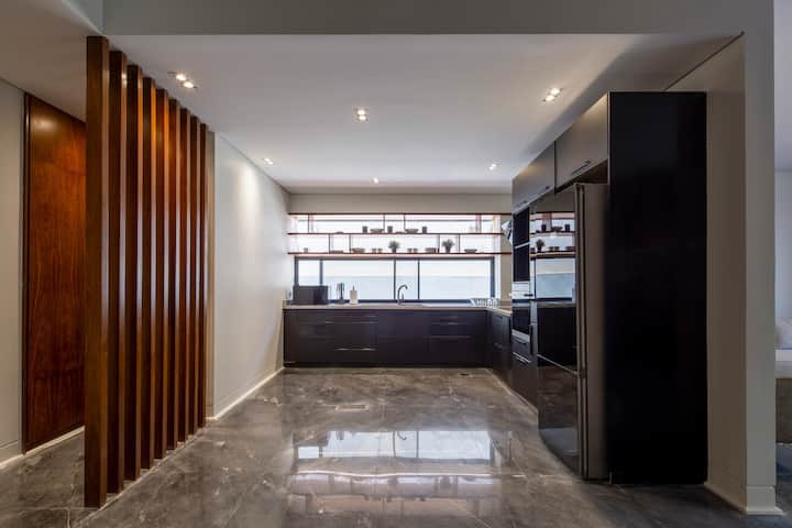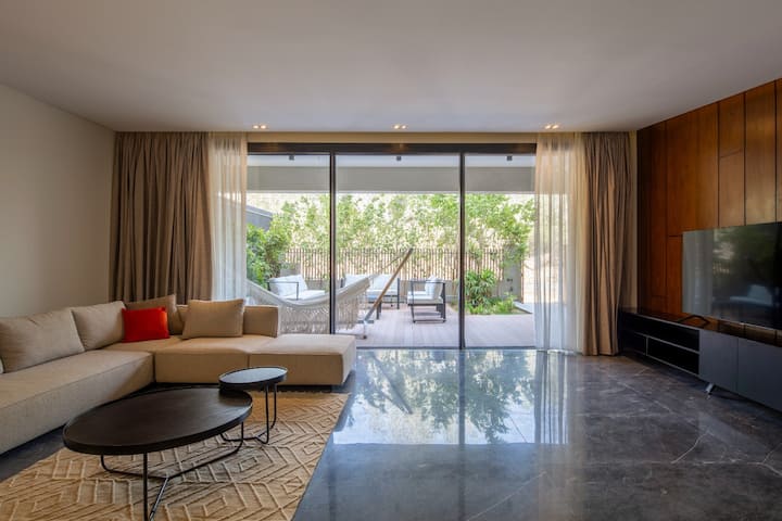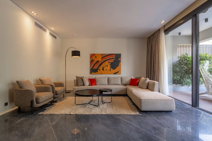One master bedroom has a walk-in closet and ensuite bathroom, 2 bedrooms share another bathroom, in addition to a maid’s room. The living area opens onto a spacious serene landscaped terrace. Live like a local. Tucked away in the secluded upscale neighborhood of West Golf Katameya, Catalina is a gem few know about. Located in a private building, this 3bdrm is finished to premium modern luxury standards, fully-equipped for every comfort.