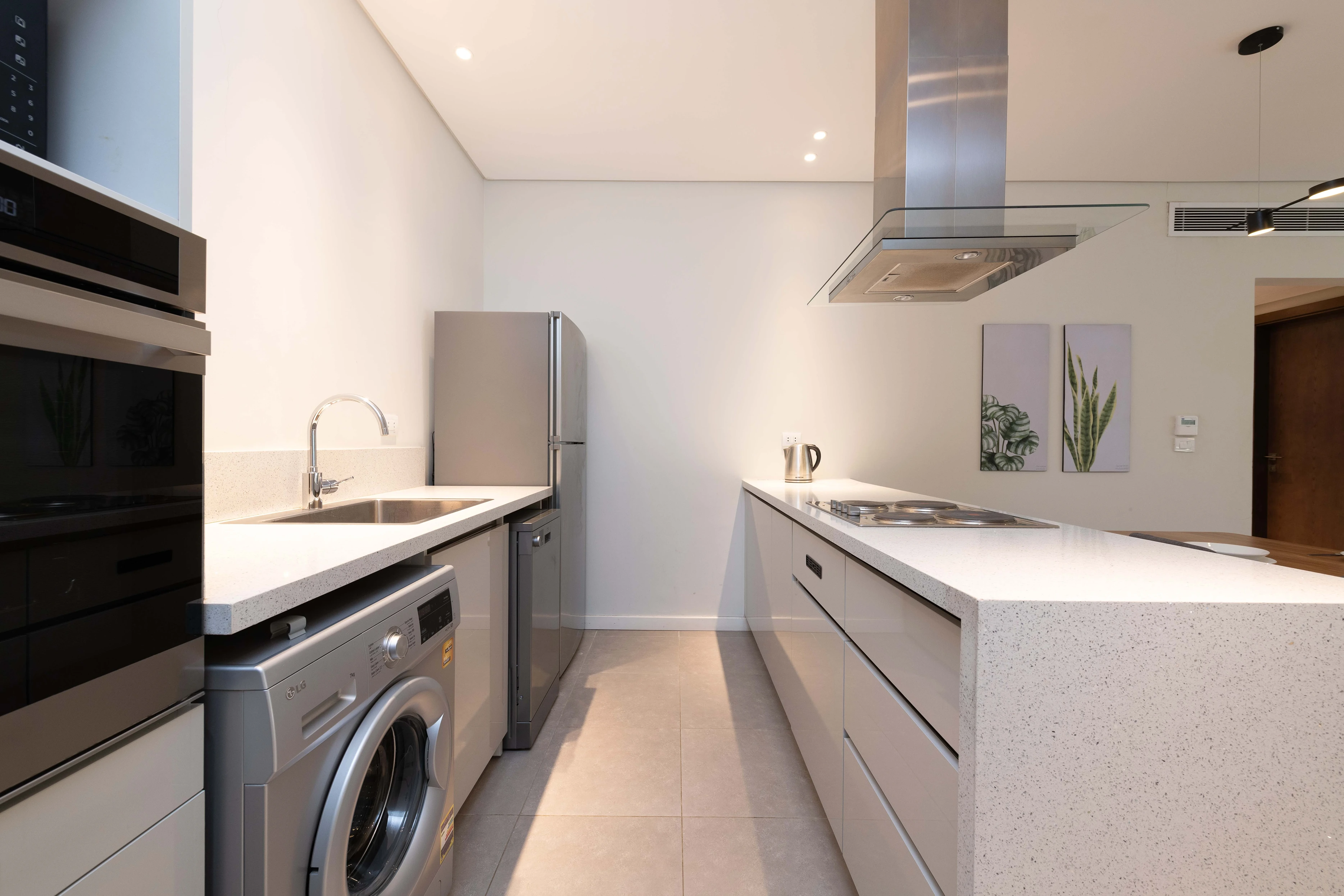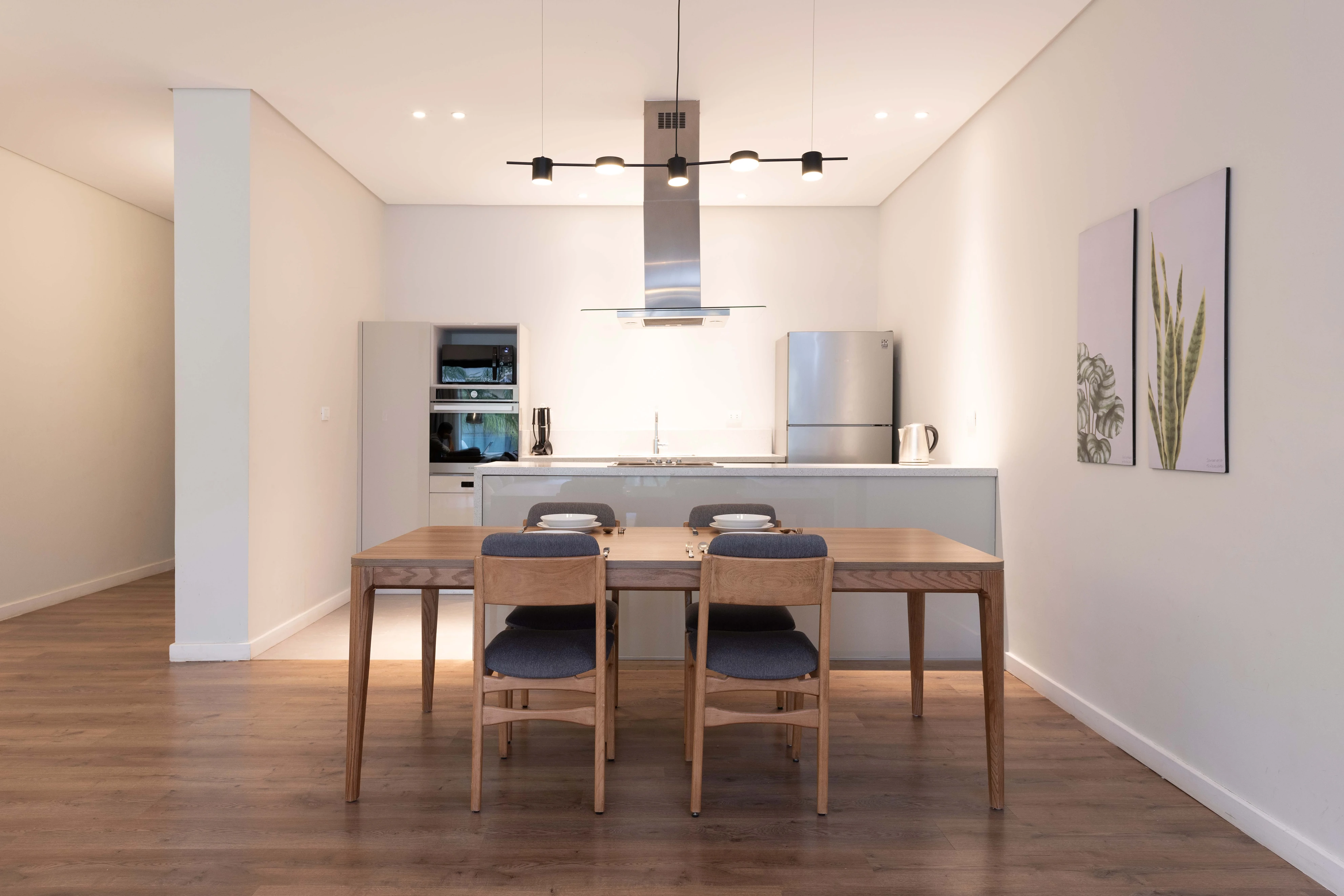 2-bedroom, 2-bathroom apartment with a spacious living area and a full wall of glass opening onto a massive terrace. A soft color palette mixed with a unique wall art brings the space alive with design and detail. An open kitchen with a dining where cooking, eating, and chilling all take place. Rivera has a sense of mild adventure embedded in her design; pair it with The Kennah Experience and you’ve got yourself the wonderous stay you seek. The apartment is steps away from Lake Town, offering guests access to fresh food, bakery treats, and everyday essentials, adding comfort and lifestyle value to your stay.