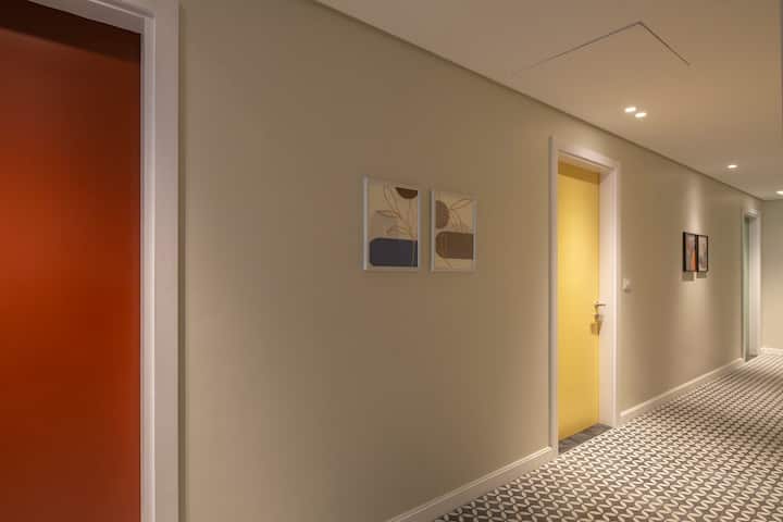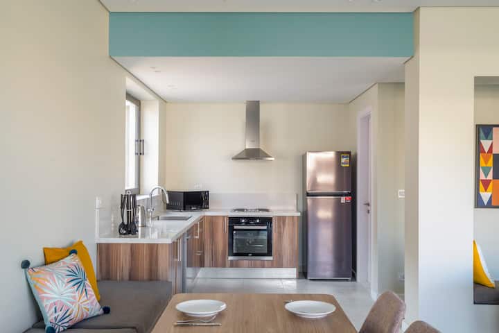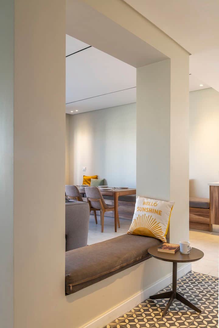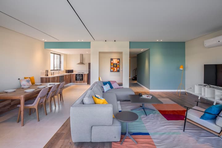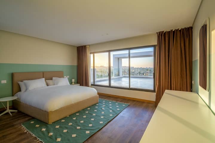 Lourina, extra-spacious 4bdrm penthouse with open roof and private pool. Overlooking the most spectacular waterscape in a gated community in New Cairo, the energetic vibe of this colorful apartment is ideal for families or groups of friends. Each bedroom has its own bathroom, and its own personality! The apartment also has a separate laundry room, guest toilet and additional shower for upstairs pool and keeping’ it cool in the pool with good times and tan lines. The apartment is steps away from Lake Town, offering guests access to fresh food, bakery treats, and everyday essentials, adding comfort and lifestyle value to your stay.