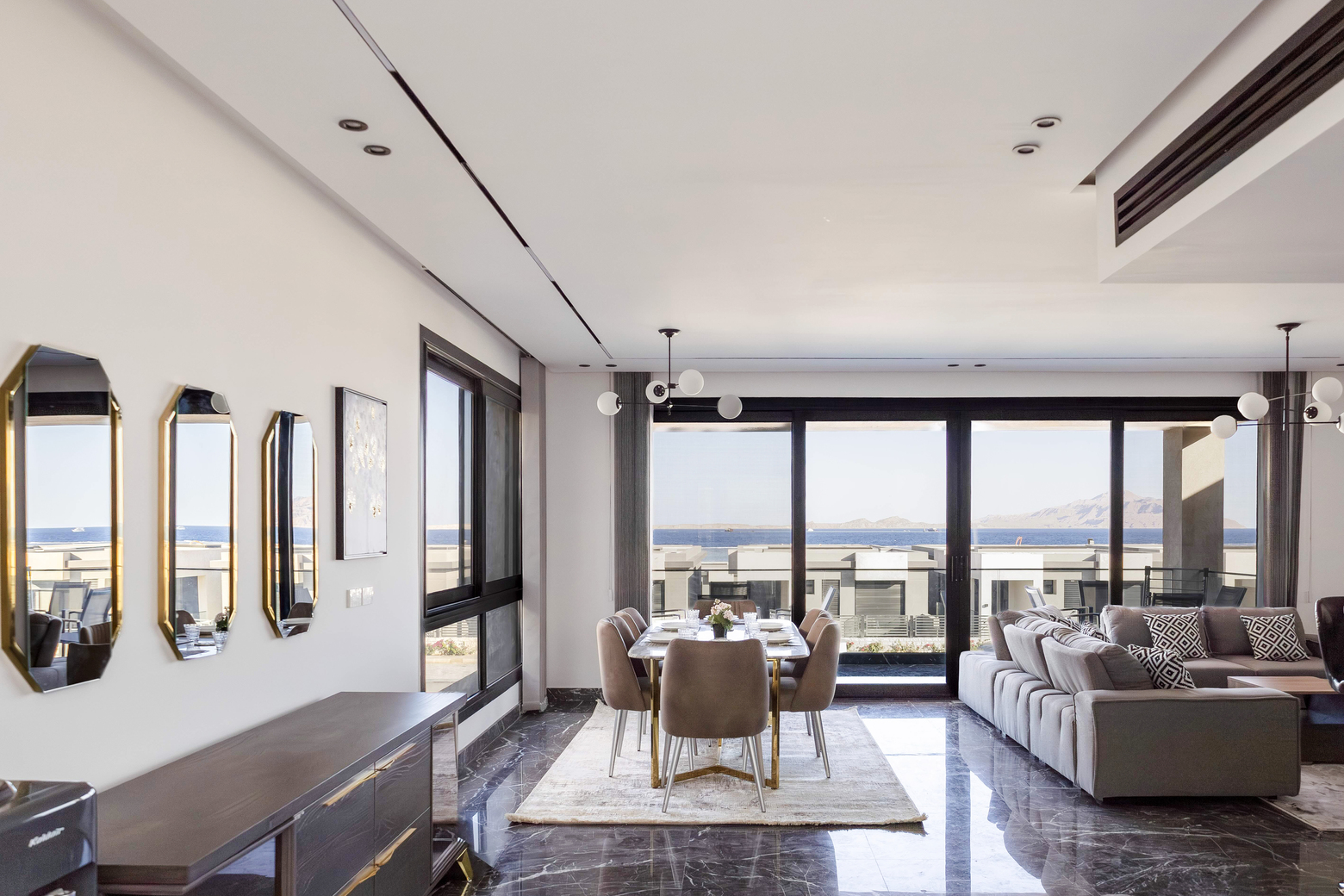 Wake up to endless shades of blue. This elegant villa is designed for those who crave both relaxation and excitement. Offering panoramic Tiran Island views, it's the perfect balance of serenity and easy access to Sharm’s vibrant attractions. About This Space: • Bedrooms & Bathrooms: Four beautifully styled bedrooms, two ensuite, plus two additional full bathrooms. • Living Areas: A bright, open-plan lounge and dining area, seamlessly extending to a spacious outdoor terrace. • Outdoor Oasis: A private swimming pool with sun loungers and a shaded dining area. Relax & Unwind: Enjoy morning yoga with sea views or unwind in the evening with a cocktail by your private pool. Fully-Equipped Kitchen: A state-of-the-art kitchen allows you to prepare gourmet meals or hire a private chef for an unforgettable dining experience. Exclusive Amenities: With a complimentary car, you’re just moments away from Sharm’s finest restaurants, beach clubs, and attractions. Plus, take advantage of exclusive discounts on excursions, water sports, and entertainment. (Terms & conditions apply.)