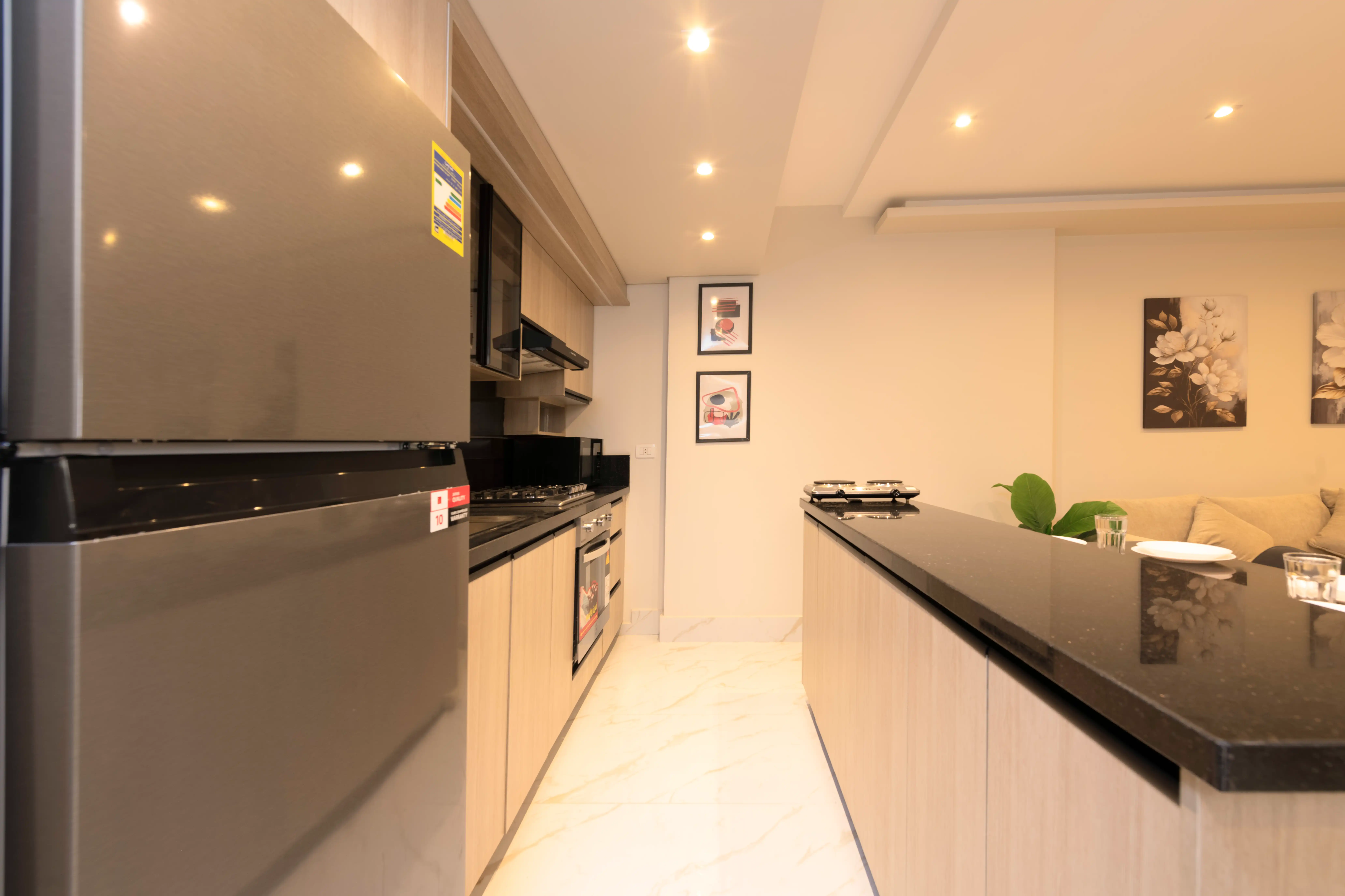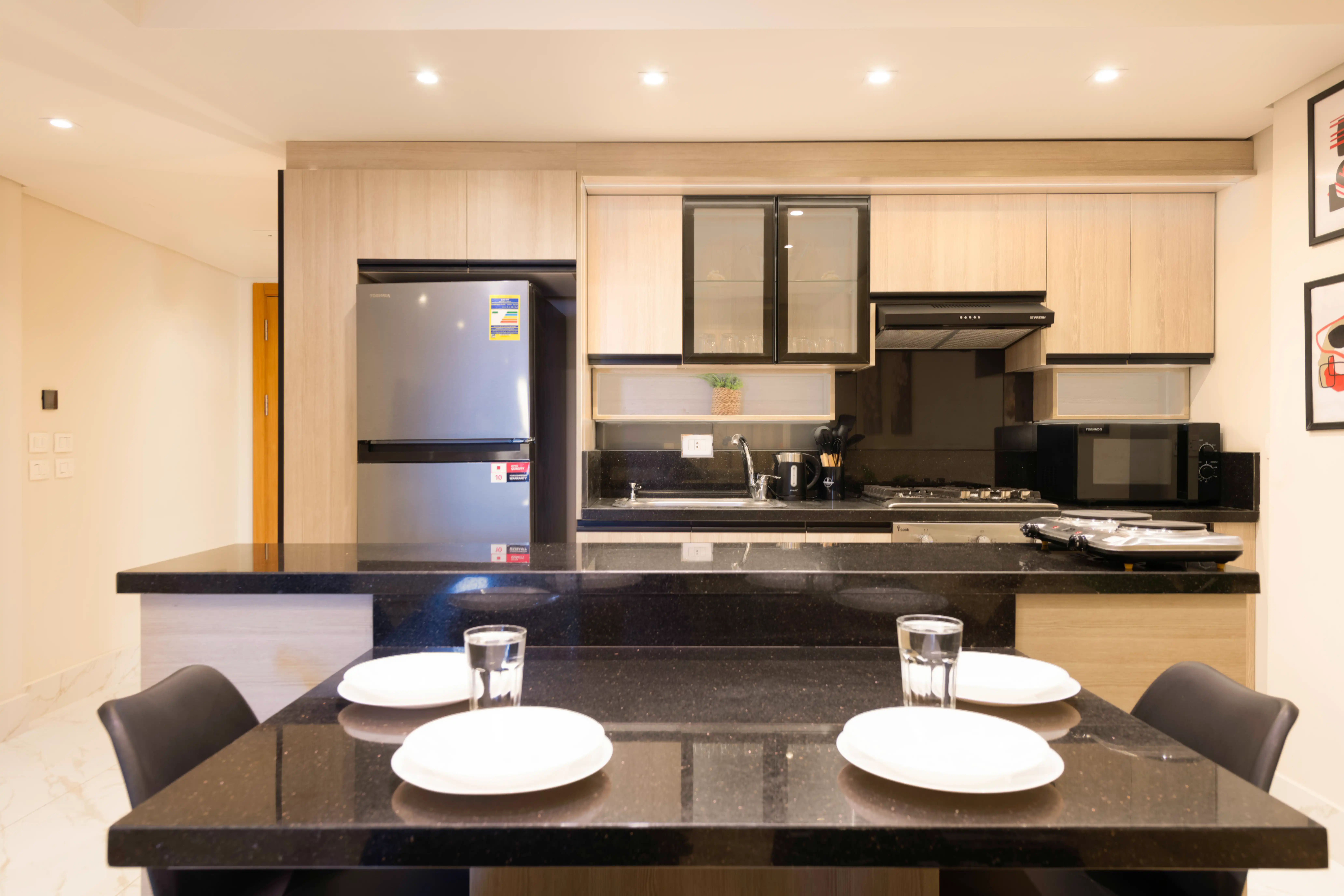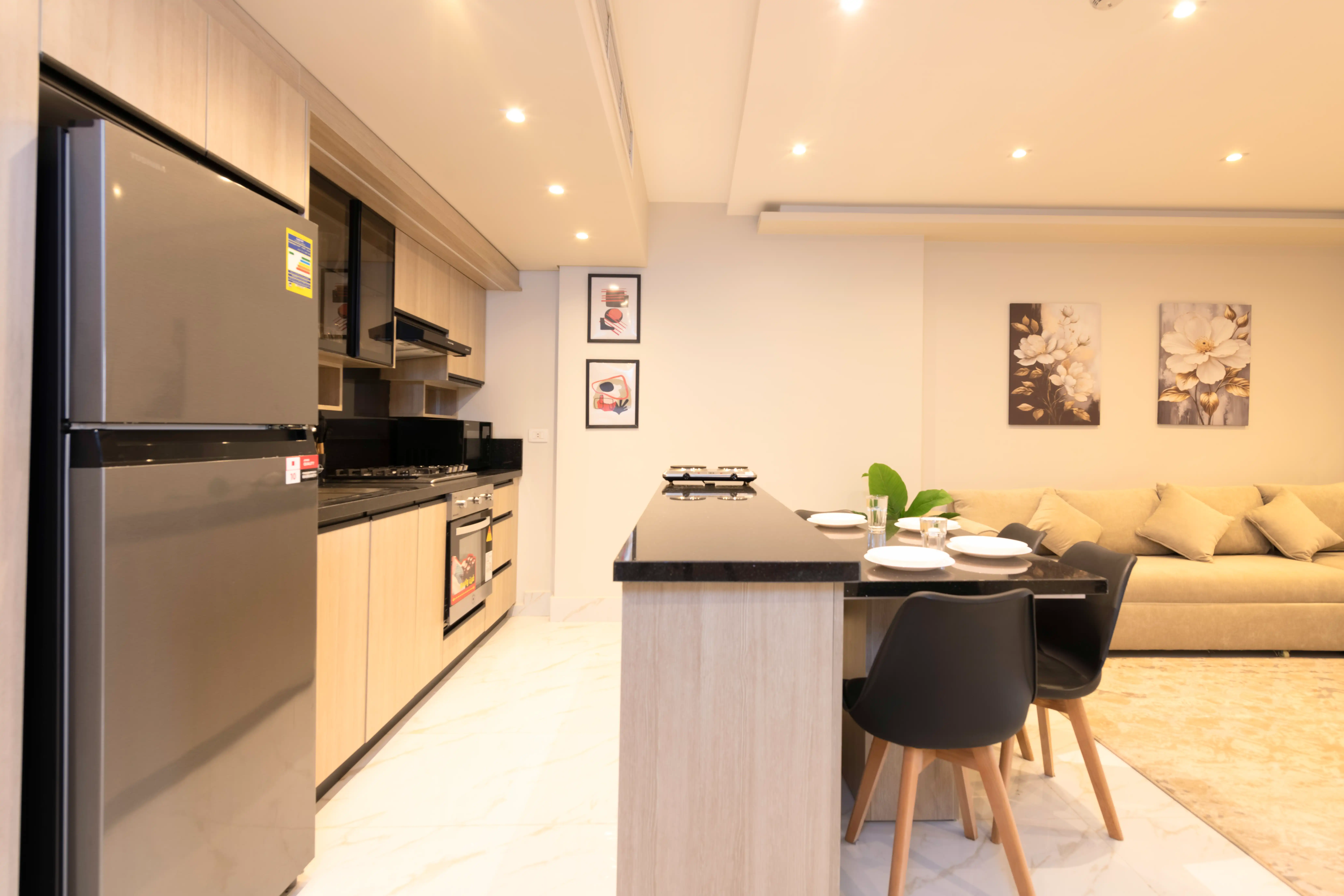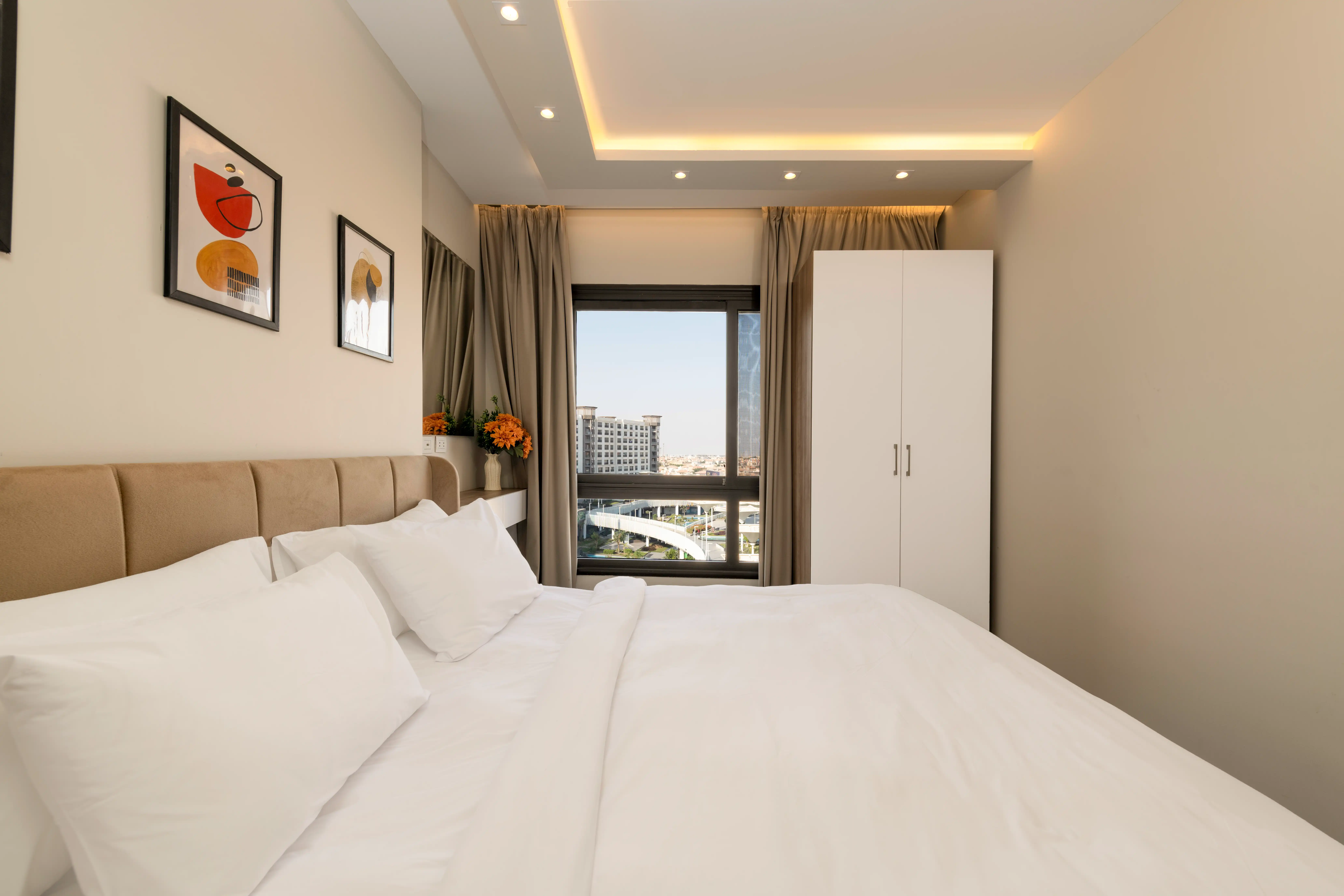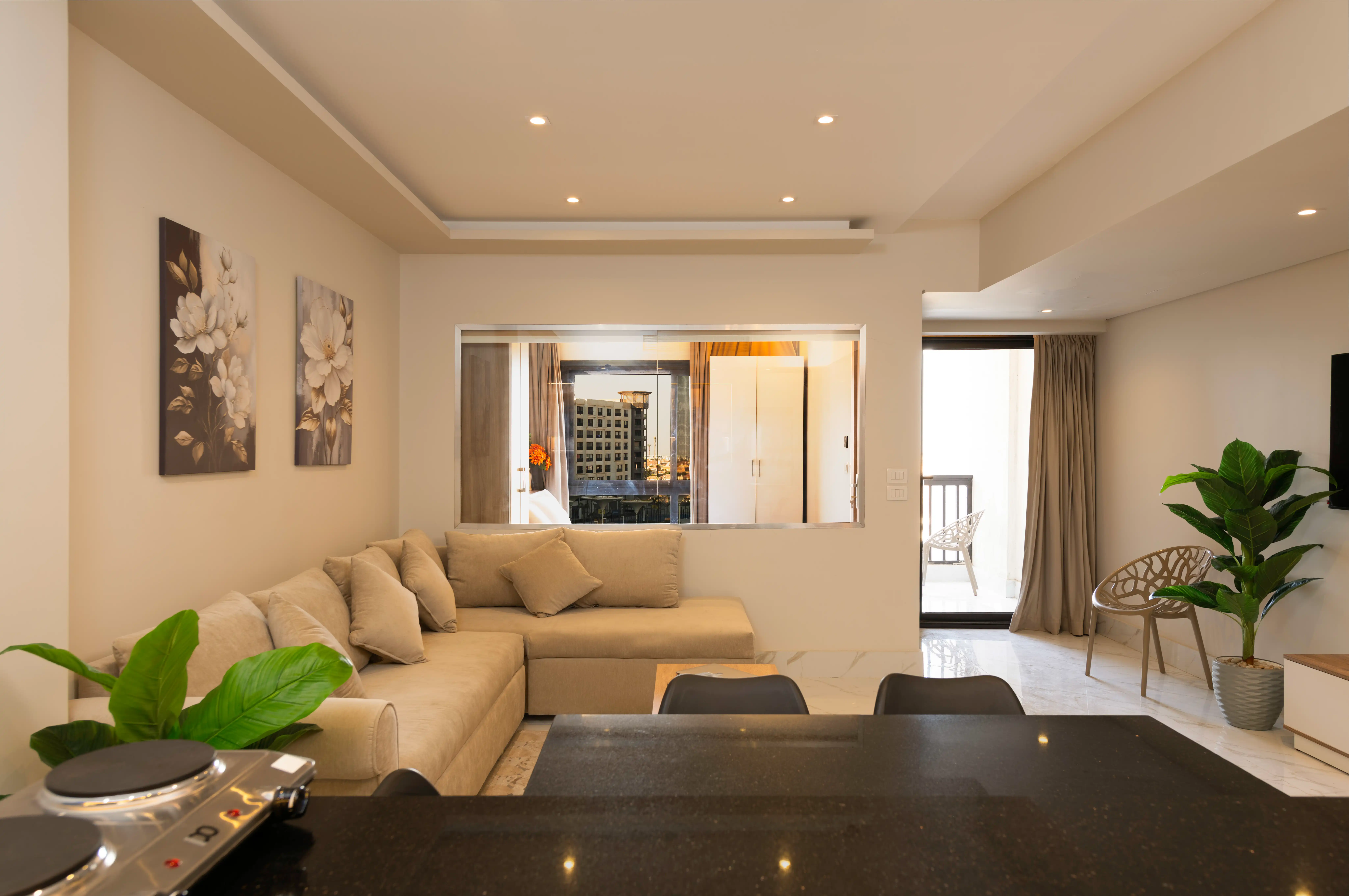 A bright, modern 1-bedroom apartment designed for comfort and effortless living in the heart of Porto New Cairo. Steps away from Americana Plaza, The Park Mall, Lulu Hypermarket, and endless dining spots, this home is ideal for business travelers, couples, and short city escapes. The space Living Area: A warm, inviting lounge with a large L-shaped sofa, soft neutral palette, elegant floral artwork, and ambient lighting. Perfect for relaxing, reading, or unwinding after a long day in New Cairo. Kitchen & Dining: Fully-equipped open kitchen with sleek cabinetry, microwave, stove, and a contemporary dining counter with chic black chairs ideal for quick meals or working comfortably. Bedroom: Cozy bedroom separated with a wide glass opening bringing in natural light, featuring a comfortable bed, stylish wall art, and built-in wardrobe. Bathroom: Modern, well-finished bathroom with clean lines and a hotel-style feel. Guest access Guests have full access to the apartment and all Porto New Cairo facilities. The location places you within minutes of top cafés, restaurants, supermarkets, and transportation links. Included Amenities - Smart lock - Fast WI-FI - Fully Equipped Kitchen - Air Conditioning - Smart TV - In-Unit Washer - Free Parking in the compound - 24/7 Security & Gated Community - Elevator Access Nearby Attractions - Americana Plaza Mall – 2 min walk - Pharmacies – Multiple options within a short walk - Hardee’s – 1–2 min walk - The Park Mall – 3 min walk - Lulu Hypermarket – 5 min walk - Coffee shops, bakeries & restaurants all around - Teseen Street – 3 min drive - Cairo Festival City – 10–12 min drive - EDNC (basically across the street) - Waterway (5 minutes away)